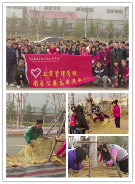 12月7日上午九时,彤星公益志愿者团队联合李沧区东部办、康泰源建筑集团来到合川路工地,为小树苗铺草席保温,让这些来自南方的树种在岛城度过一个温暖的冬天。
