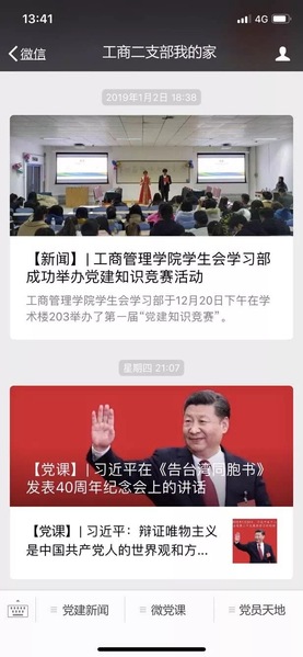 支部创办了“工商二支部我的家”微信公众号,定期或不定期地在公众号中推送党建内容新、效果实的热点文章、微视频等,同时建立互动微信群,党员同志们可以交流分享自己的心得体会,学习感悟,真正将学习成果内化并指导日常工作。