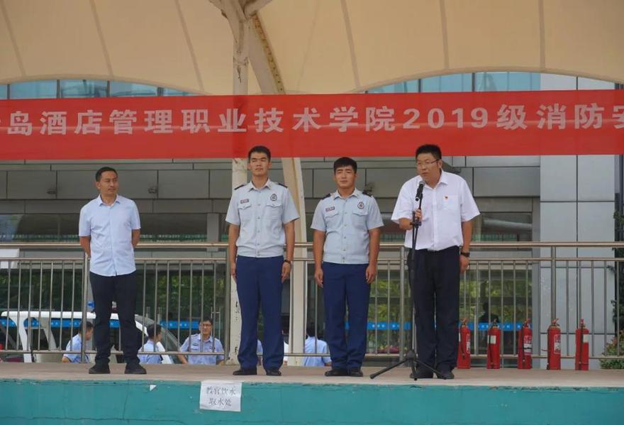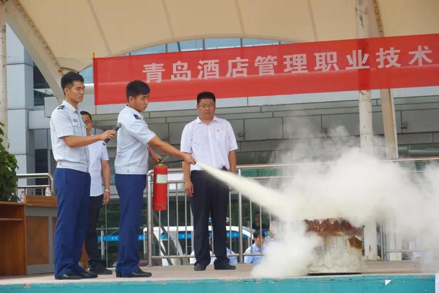 在操场,李沧区消防战士指出在演习过程中的不当之处以及如何整改。两名消防战士拿着灭火器在两三米远处向燃烧的木材喷射,演示了灭火程序和注意事项,使同学们牢记灭火器的使用步骤让安全的警钟时刻敲响。