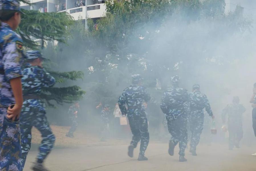 伴随着一阵急促的警笛声,同学们有秩序地从冒着浓烟的公寓中赶忙跑向操场。