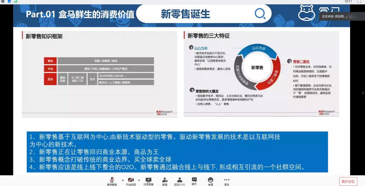 讲座中,赵宏远回顾了盒马鲜生的成长史,在短短四年的时间如何由上海一家小店拓展到全国几十家门店,在此基础上分析盒马鲜生的消费价值以及盒马先生的重构。与我国其他大型传统超市比较,通过在线分享商务、移动电子商务、线下商务的有效聚合,发展新零售模式,能够打造线上--移动-线下三位一体全时空的营销系统,使企业与用户能够通过各种载体及终端进行交易和消费。目前,盒马鲜生在价格、产品种类、体验式营销和自主支付的优势吸引了大量的消费群体,赵宏远表示日后的盒马鲜生会继续扩大优势,商业模式上不断创新,并希望有更多的年轻人,公司员工加入到盒马人的行列。