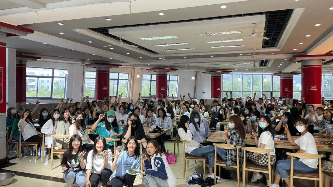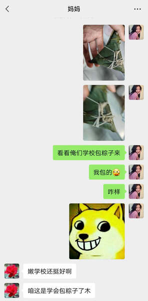 一场包粽子大赛拉开帷幕。粽子虽小,门道不少,看似简单,但要做出馅料十足外观漂亮的粽子还是要下一翻功夫的。大部分同学都是第一次包粽子,带着新奇和试探,虽然包的不是太好,但看着自己亲手包好的粽子很是欣喜。大家围坐在一起,你一言我一语,现场气氛祥和、其乐融融。不少同学们将喜悦的心情连同节日的祝福,在线分享给远方的父母。