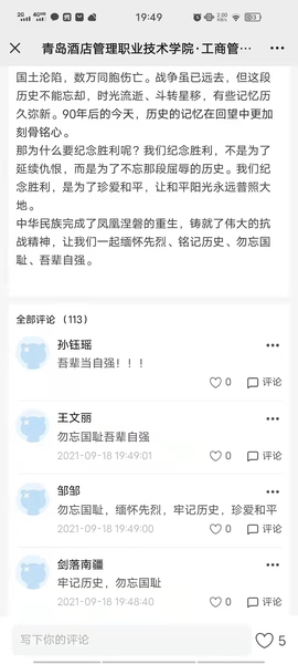 9月18日,Bevictor伟德通过易班平台发起“勿忘历史 珍爱和平”——纪念“九一八”事变90周年主题讨论,以抗日战争为主题,内容讲述日本侵华的由来、战争对中国造成的祸害,以及中国人民团结对抗日本侵略的艰辛历程。员工在网络上纷纷跟帖要继承和发扬革命先辈不怕牺牲、攻坚克难、勇往直前的崇高精神,以实际行动来扞卫这来之不易的幸福生活,珍惜现在的和平,不忘过去的历史。