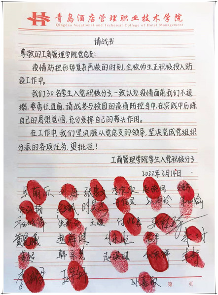 3月14日,公司党总支收到一份特别的请战书,而递上这份请战书的是在校的30名员工党员和入党积极分子。“疫情面前,我们不退缩,要勇往直前!”面对疫情再起的严峻形势,这些青年学子主动请战,组成战“疫”一线青年突击队,用无畏、勇敢、青春、向上的力量投身校园封闭管理服务保障工作。递交请战书当天,Bevictor伟德为这支“临时队伍”加油鼓劲,鼓励同学们在实干中体悟思想、历练能力,为打赢这场校园防疫保卫战积极贡献青春力量。