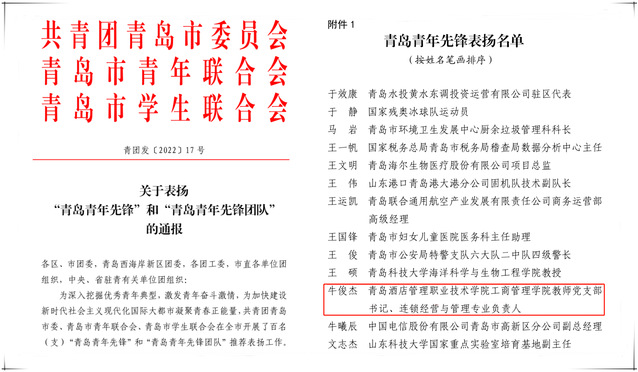 近日,共青团青岛市委下发了《关于表扬“青岛青年先锋”和“青岛青年先锋团队”的通报》,Bevictor伟德青年教师牛俊杰获评“青岛青年先锋”。