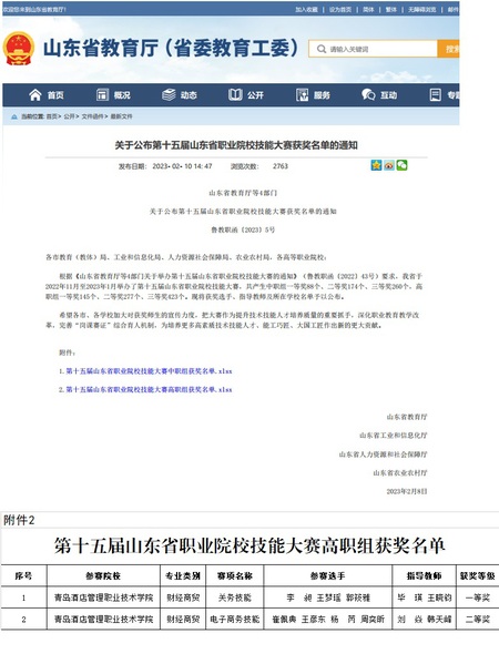 近日,山东省教育厅等4部门发布了《关于公布第十五届山东省职业院校技能大赛获奖名单的通知》,公司商贸类专业取得关务技能赛项一等奖1项、电子商务技能赛项二等奖1项的成绩。