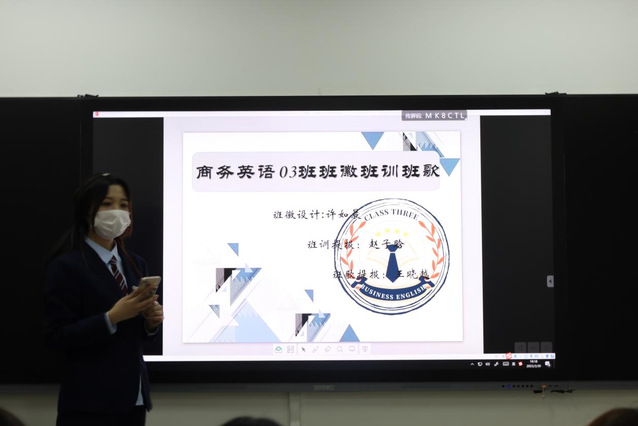 在团队文化展示环节,各班依次上台展示班徽、班训和班级口号,充分讲解各自的创作理念和团队文化。在班级秀环节中,通过展示团队创意队形,高唱自选班歌,生动展示了各班级的活力风采。