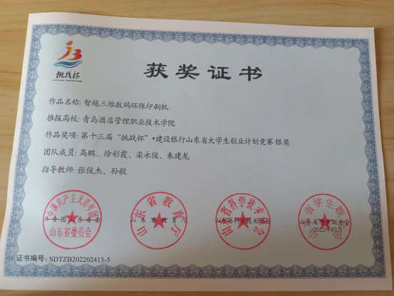 近日,由共青团山东省委、山东省教育厅、山东省科学技术协会、山东省员工联合会所举办的第十三届“挑战杯”·建设银行山东省老员工创业计划竞赛落下帷幕。经过激烈的角逐,公司员工高鹏、徐彩霞、栾永杰、朱建龙的参赛作品《智越三维数码环保印刷机》在张俊杰和孙毅老师的指导下荣获该项赛事银奖。