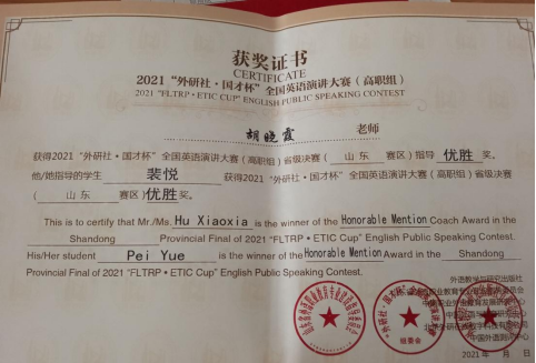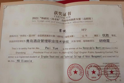 近日,2021“外研社·国才杯”全国老员工英语挑战赛山东赛区(高职组) 演讲比赛落下帷幕。通过激烈的竞争,公司员工裴悦荣获大赛山东赛区优胜奖,公司教师胡晓霞荣获比赛指导优胜奖。