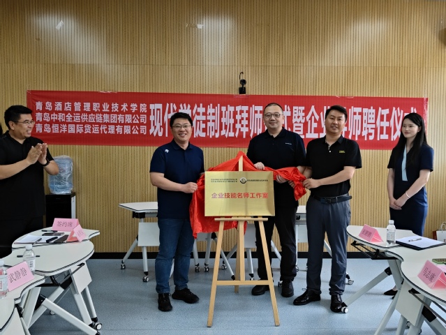 仪式上,潘华南与青岛恒洋国际货运代理有限公司总经理史林、青岛中和供应链集团销售公司总经理代海峰共同为企业名师工作室揭牌并签订现代学徒制试点项目联合培养协议。