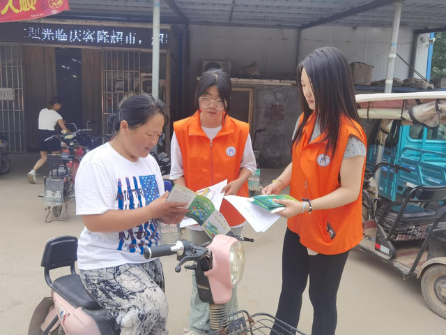 图为实践践行团成员进行乡村调研并发放防溺水、防诈骗等安全教育宣传册