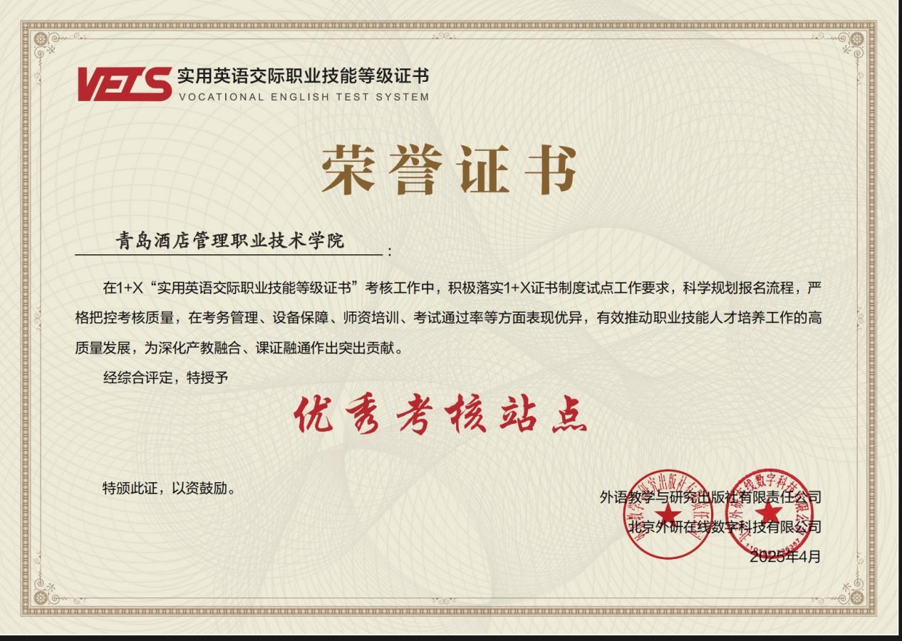 近日,2025年度1+X实用英语交际职业技能等级证书“优秀考核站点”名单公布,公司获评“优秀考核站点”。