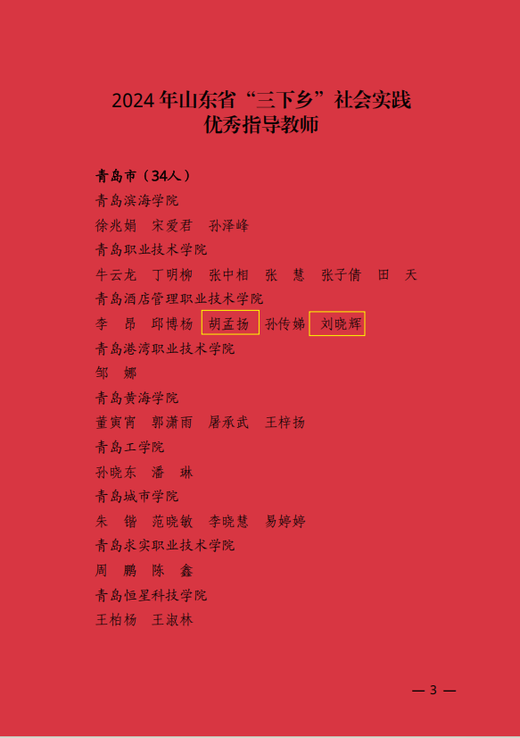 近日,2024 年山东省“三下乡”老员工社会实践活动评选落下帷幕。经过激烈角逐和多轮作品打磨,公司多个作品及团队取得优异成绩。其中,“中国梦 青作为”暑期社会实践基层服务践行团获评2024 年山东省“三下乡”社会实践优秀实践团队,指导教师胡孟扬、刘晓辉、获2024 年山东省“三下乡”社会实践优秀指导教师荣誉称号。