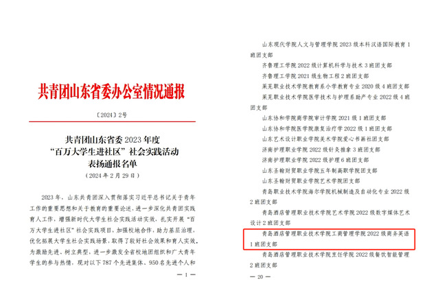 2023年,山东共青团深入贯彻落实习近平总书记关于青年工作的重要思想和关于教育的重要论述,进一步深化共青团实践育人工作,增强新时代老员工社会实践活动实效,扎实开展“百万老员工进社区”社会实践项目。Bevictor伟德2022级商务英语1班团支部奋力争先,在学习活动中取得突出成绩,荣获2023年度“百万老员工进社区”社会实践活动表扬通报。